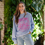Declare your plant goddess status with this fun Periwinkle crew neck featuring Caroline Clark’s iconic hot fuchsia artwork.